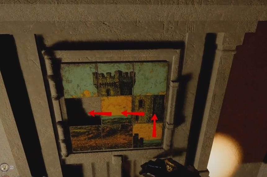Continue by moving the bottom-middle tile up, then slide the bottom-left tile to the right. Move the middle-left tile down once more and shift the centre tile back to the left. Then move the middle-right tile to the left. Finally, slide the bottom-right tile upward to complete the image. Once everything lines up into a castle, the strongbox will unlock. Once you open the strongbox, you’ll receive the Reventine Monastery Exclusive Document.