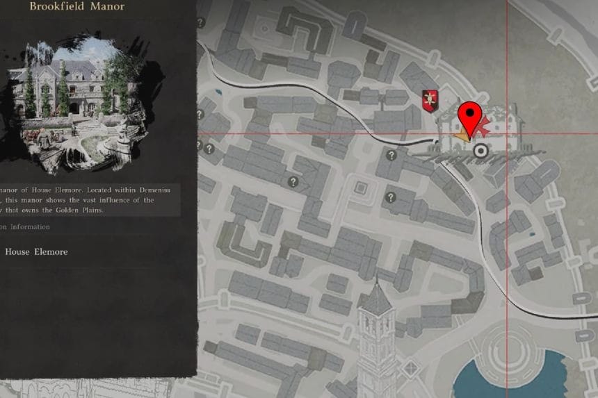You’ll find this strongbox on the second floor of Brookfield Manor, located on the northeastern side of Demeniss. It’s hidden behind a rotating bookshelf inside one of the rooms. Since the guards won’t let you in through the front door, the easiest way is to climb up to the second-floor balcony and enter through a window. Alternatively, if you have a key, you can also use the second-floor door to get inside.