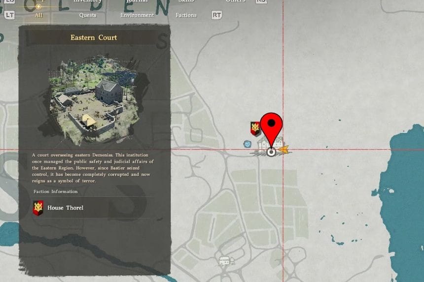 You’ll find this strongbox underground in the basement of Eastern Court, which is located east of the city of Demeniss. Since the ground floor is heavily guarded, it’s best to go around to the back of the manor where no one is watching. From there, climb up the wall to a second-floor window and enter the building quietly.