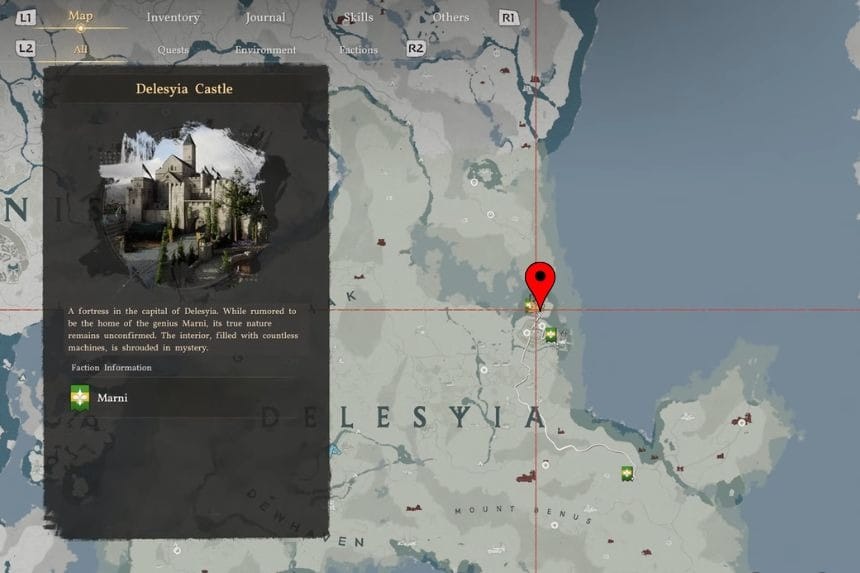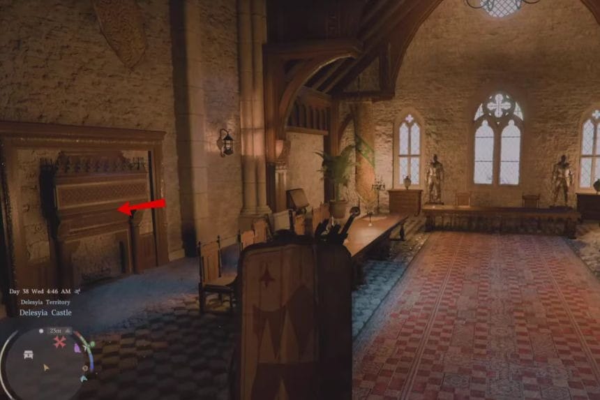 You’ll find this strongbox in the dining hall of Delesyia Castle, hidden behind a rotating bookshelf. To get inside the castle, equip the Visione helmet first, then climb up the castle walls and enter through the rooftop door. Once you’re in, head to the dining hall to find the strongbox.