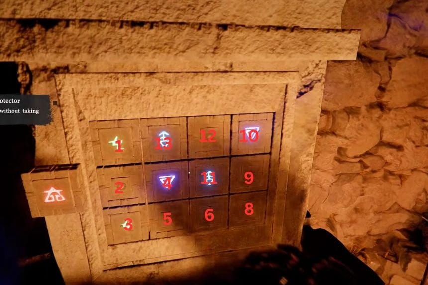 Once you reach the puzzle, you need to press the buttons in a specific order. Start with the top left button, then press the bottom middle one. After that, press the bottom left, followed by the bottom right, and finish by pressing the top left again. If done correctly, the device will activate and unlock successfully. Once you’ve finished the puzzle, the wall panel will drop down and reveal a handle. Just interact with it to turn the power on. After that, head back up the stairs to where Octavius is waiting.