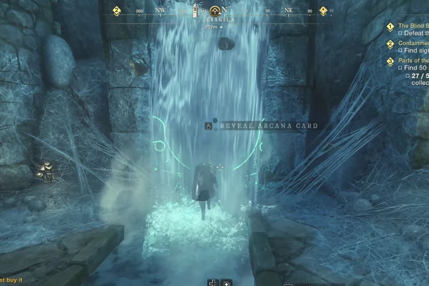 From the Church of the Last Days waypoint, head south toward Esagila. The shrine containing the card is hidden deep inside Uttu’s battle arena, right at the bottom of the waterfall.