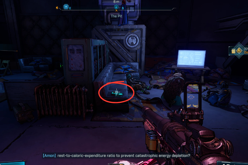 You will find “Handful of Trouble” inside The Pit, lying on a long couch next to a small group of people.