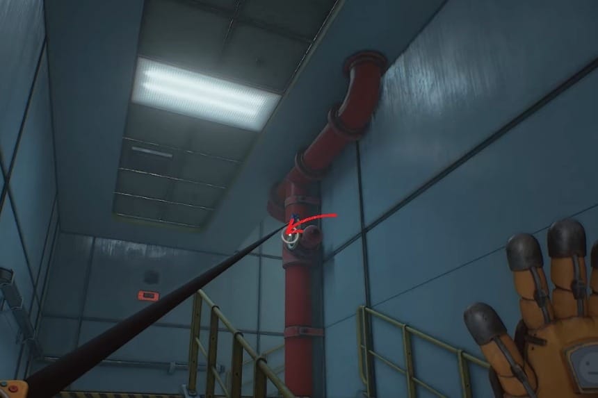 Following the depletion of gas, you will discover a damaged area in which it is necessary to utilize the GrabPack to unlock and gain access through a blocked door. The means of unlocking that door also provides a means to recharge the Conductive Hand with fire; that fire charge can then be used to create an explosion by igniting the gas through the use of a burner station.