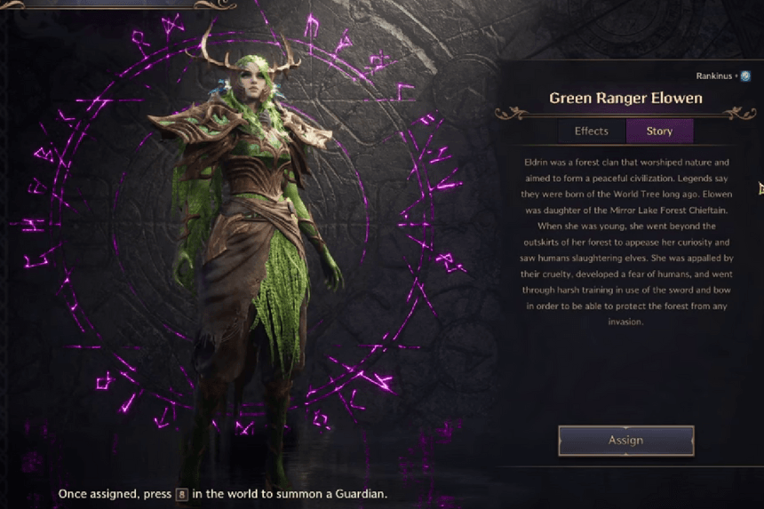 First, find a Small Elemental Tree on the south bank of the River of Abundance. Interact with it, and a blue light will appear. Follow the light to five ghostly trees and touch them. Then, interact with another Small Elemental Tree nearby to complete the quest. Finally, claim your rewards to unlock the Green Ranger Elowen Guardian.