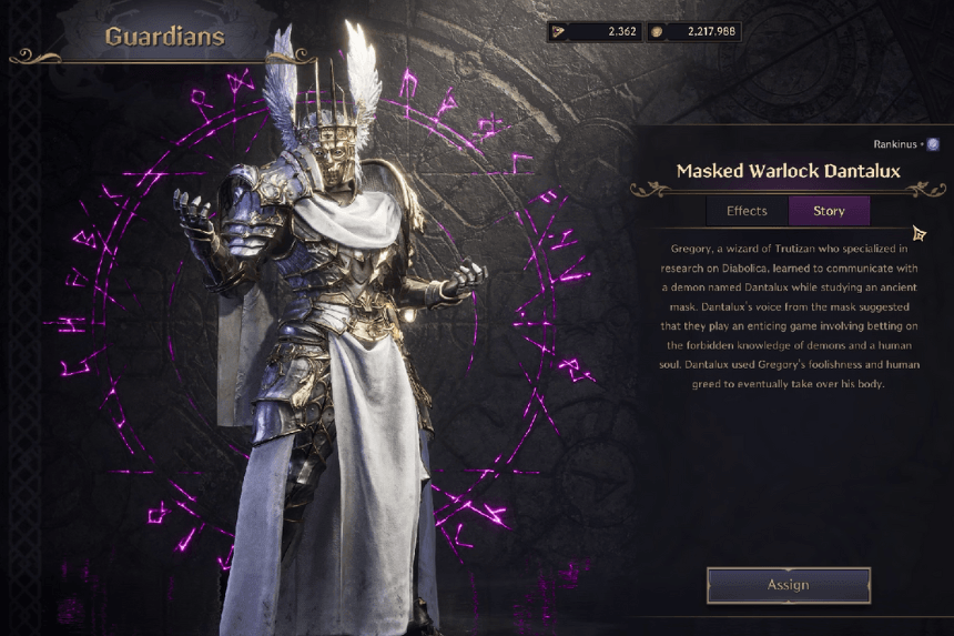 Masked Warlock Dantalux is a Guardian you can unlock by completing a quest called “The Voice Behind the Mask” at the Sandworm Lair in Stonegard. His special ability, Abyssal Sanctuary, lets him recover 26% of the mana he spends on abilities. He also heals his nearest party member for 53% of that member’s missing mana.