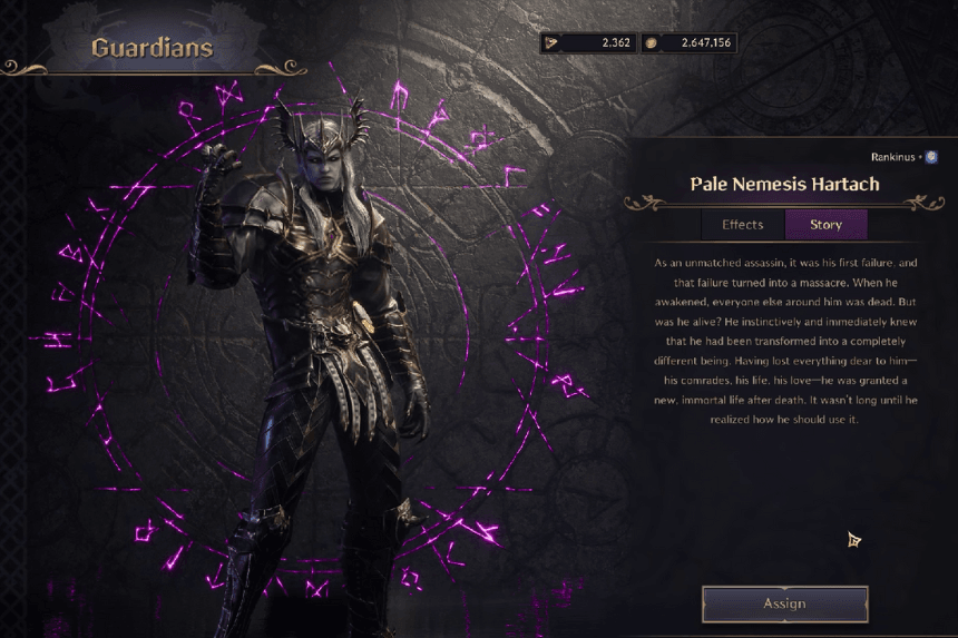 Pale Nemesis Hartach is a Guardian you can unlock by completing a quest called “Farewell” at the Watcher’s Post or Ruins of Turayne. His special ability, Stealth Blade, lets him hide for 5 seconds after he kills an enemy within 3 seconds. At night, he can hide for 7.5 seconds. His first attack after coming out of hiding is always a critical hit.