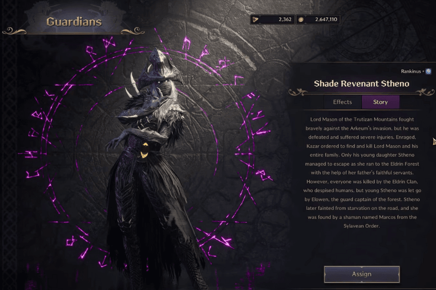 Shade Revenant Stheno is a Guardian you can unlock by completing a quest called “For Whom the Bell Tolls” at the Ruins of Turayne. Her special ability, Dread Shard, fires 5 projectiles at random enemies within 10 meters every second. An enemy can be hit by multiple projectiles at once. Each projectile does 52% of her base damage.