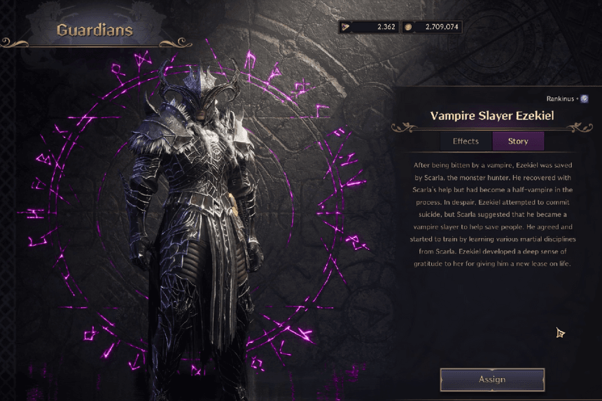 In the Temple of Sylaveth, you’ll explore the halls and learn about the story of Ezekiel, a vampire slayer. You’ll then fight a vampire named Leonardas. If you win, you’ll become Vampire Slayer Ezekiel, your first Guardian.