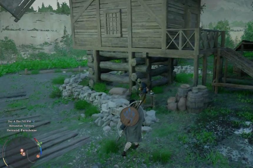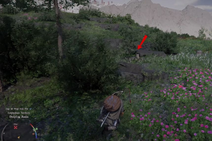 To get the Volono Sword, go to the location marked on the map above. You will find a camp in front of you. Take a right turn towards the flower bed to find a tree stump near a small water pond. On the tree stump, you will find the Volono Sword.