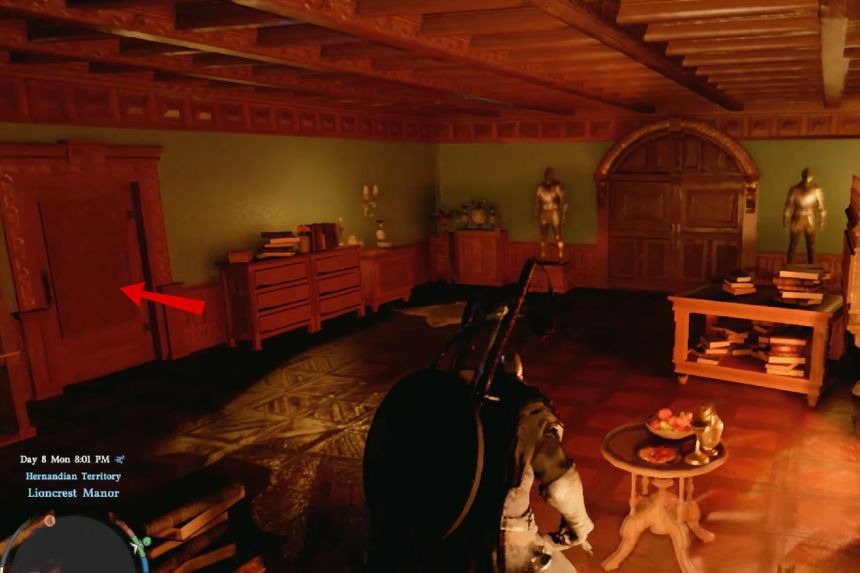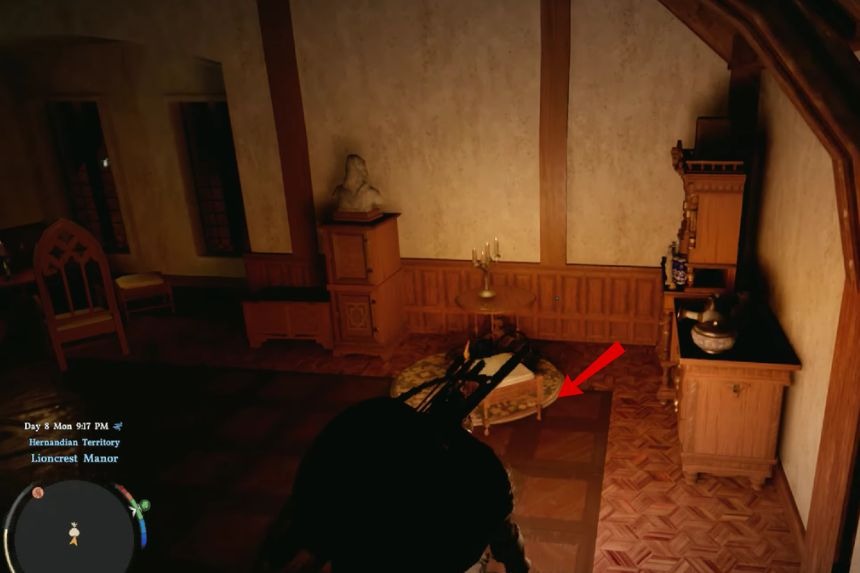In the Lioncrest Manor, enter the building from the middle of the window. Once inside, open the big door in front of you. Then move forward to steal a key near a tea table. Now, on the left side you will unlock the door with the key to find Rhonid large shield.