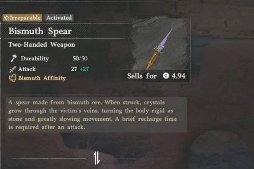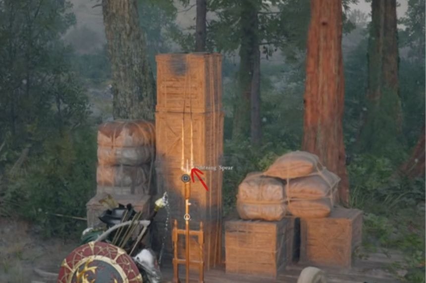 The Bismuth Spear is located in a ruined house near the Well of Enlightenment. The ruined house is located near the entrance of the camp on the right side.
