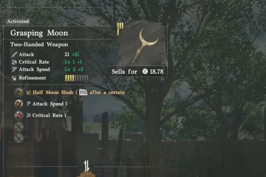 To get Grasping Moon, you need to defeat the Half Moon Reaper at the Western Court. At the beginning of the fight, go straight to the corner and wait for her to get closer. Then, roll over to her back and attack her while pushing her towards the tree.