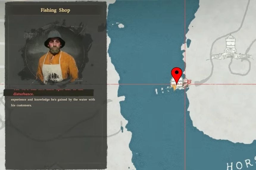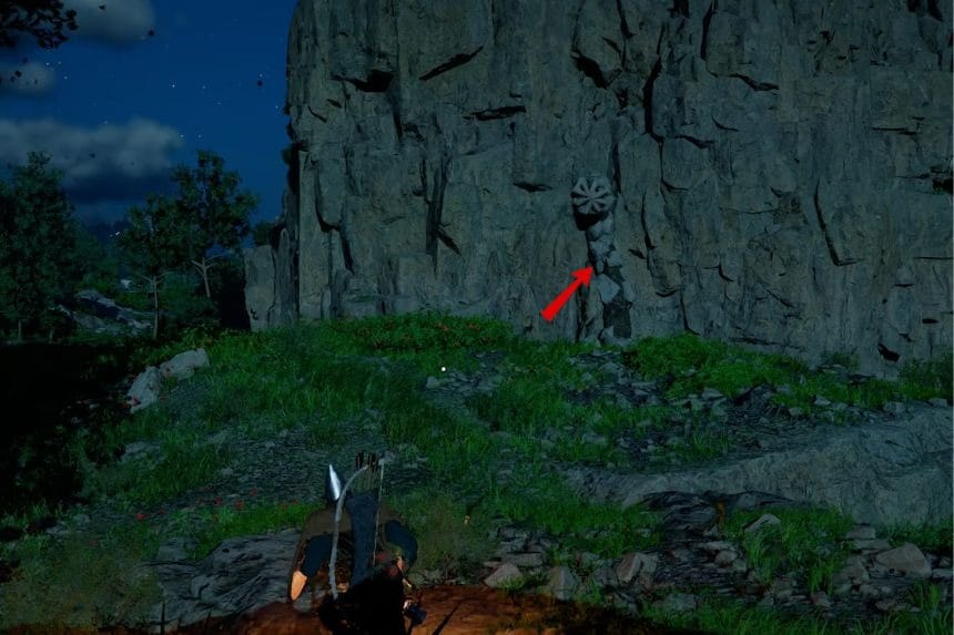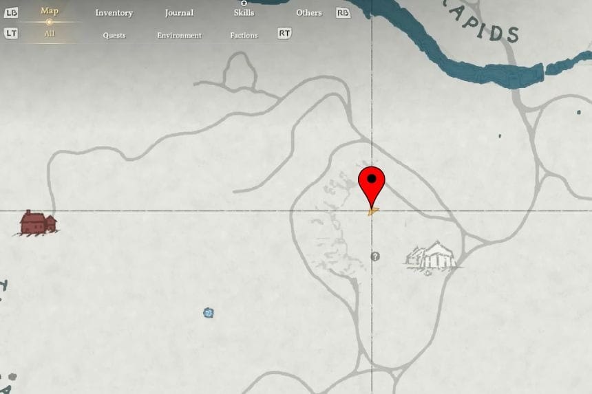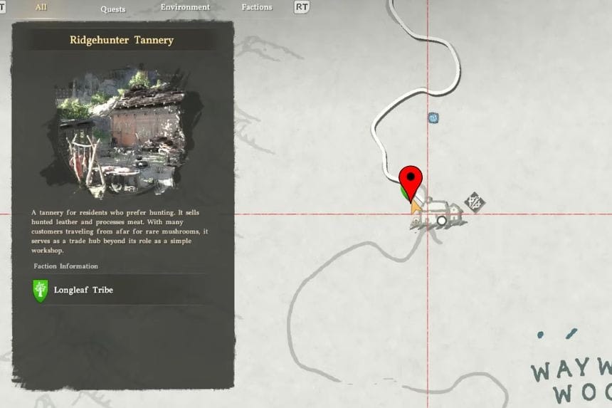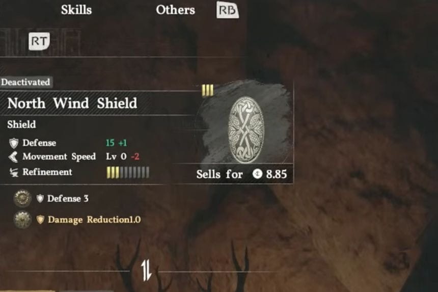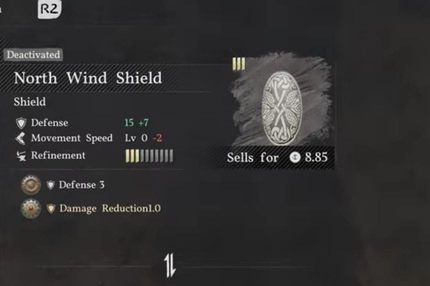 The North Wind Shield is hidden inside a small cave behind a huge fallen log north of Ridge Hunter Tannery. As the forest has fog, it will be difficult to see. Find a big tree lying on the ground which will cover the cave.