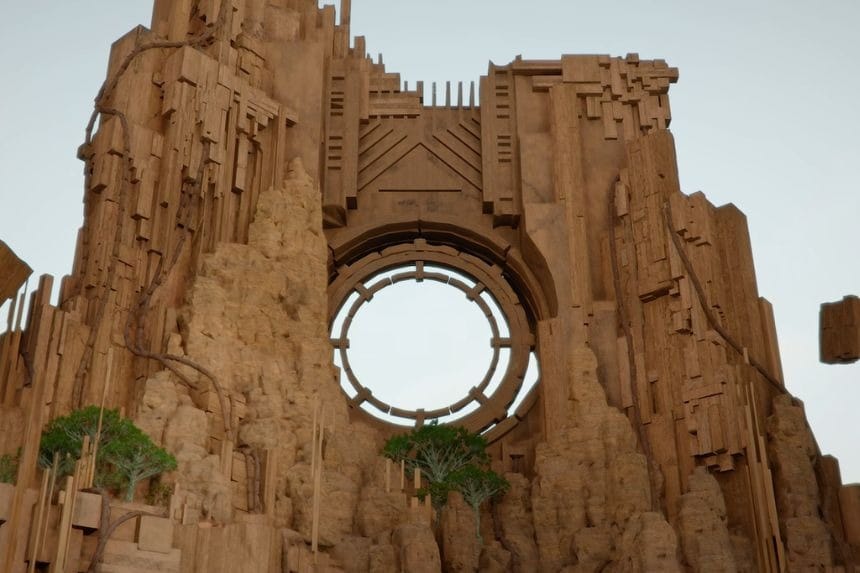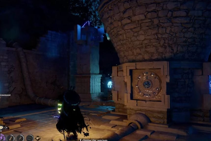 Climb up into the centre section of the archway and then use Force Palm to flip the hidden wall. After doing so, jump into the small hidden room behind it, where you will find a Treasure Chest containing the Black Sun Shield.