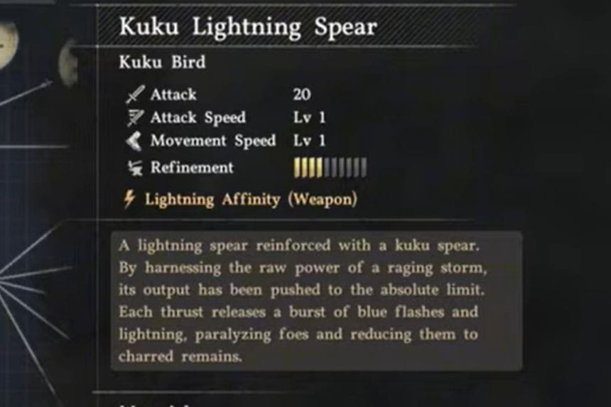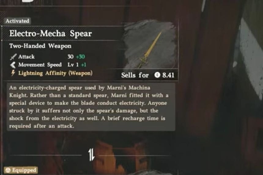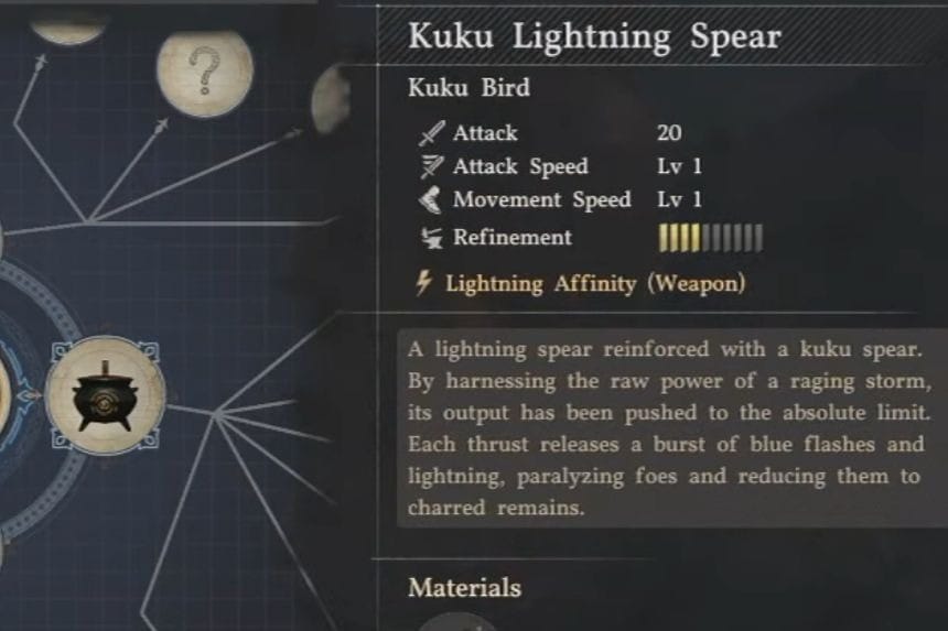 For the small batteries, they usually drop from mech enemies, the base lightning spear is found in a bandit camp north of Pailune, and electrical components can be farmed from elite mechs at Marni’s Laboratorium Gate. Once all items are collected, place them in the Kuku Pot at the Kilnden workshop to craft the fully upgraded Kuku Lightning Spear.