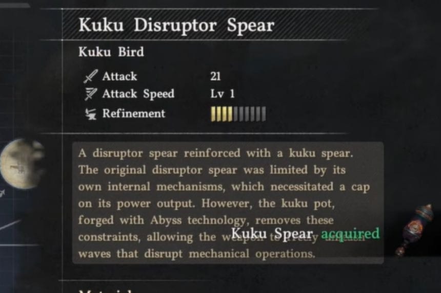 To craft the Kuku Disruptor Spear, you’ll first need to get the Disruptor Spear from Gorthak in Delesyia. The spear can be found in the Grunlore Outpost on a display. After that, you’ll need to get the Blueprint ll: Kuku Disrupter Spear from Marek.