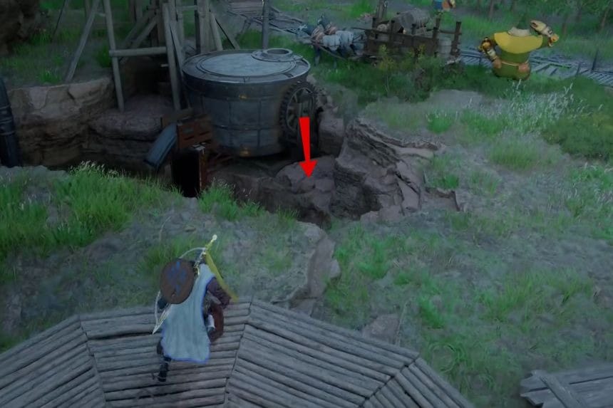 To get the Rabbit Leather Mask, you need to go inside the Quarry. First, you need to find the smaller crane in the quarry area. Climb up to reach the control point, then interact with it so you can use the crane. Use the crane to move the big rock blocking the entrance below. The crane controls can be a bit tricky, so it may take a few attempts before you successfully position the crane correctly.