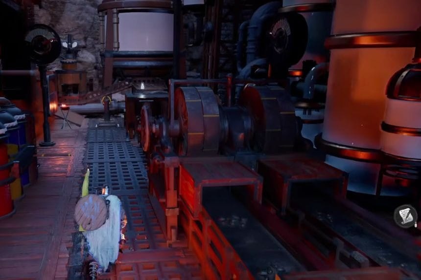 At the bottom, you will find the lubricating sprayer. Pick it up and carry it to the nearby machine on the right side and spray it until the machine starts moving. Now, climb back out through the same opening. Climb the ramps and ladders to reach the top. At the top, activate the chocolate mixer by turning the mechanism. Now, drop into the lower section nearby and push the machine there until it starts working.