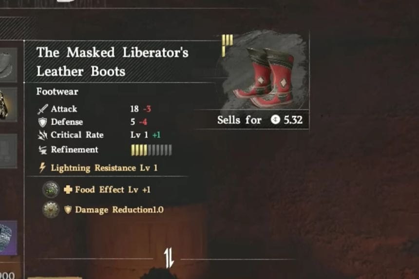 The Masked Liberator’s Leather Boots are also near Gear Melt Confectionery, inside a cave in the area. To find the hidden cave, jump down inside a big hole, near the settlement. At the corner, use your Four Palm to break open the wall and get inside the cave. Inside the cave, you will find a chest. This chest contains the masked liberators Leather boots.