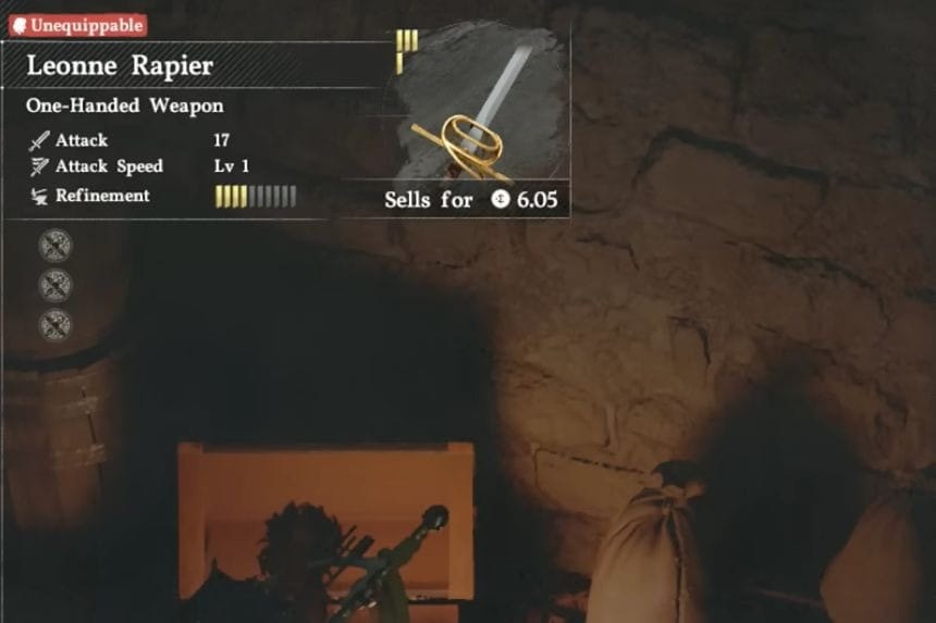 The Leonne Rapier is hidden inside a secret room at Thoron Town Hall Ruins. To get to the secret room, you need to find the wooden plank on the side of the walls. Break open the wooden planks to find a secret room where you will get the chest containing the Leonne Rapier.
