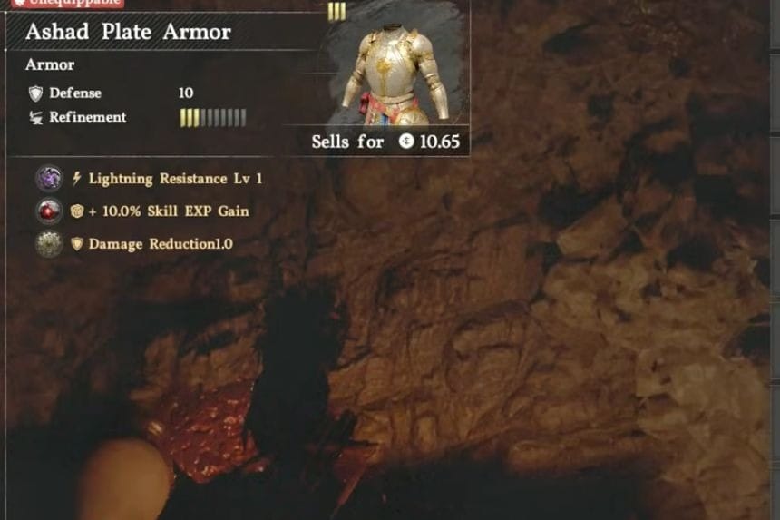 The Ashad Plate Armor is hidden inside the northern cave at Silver Wolf Mountain, northeast of Bolstein Ruins. Once you reach the fast travel point near White Waste Sanctuary, the waterfall you need is directly below it. Jump down from the fast travel point and head toward the waterfall. To get behind the waterfall, use your stab ability.