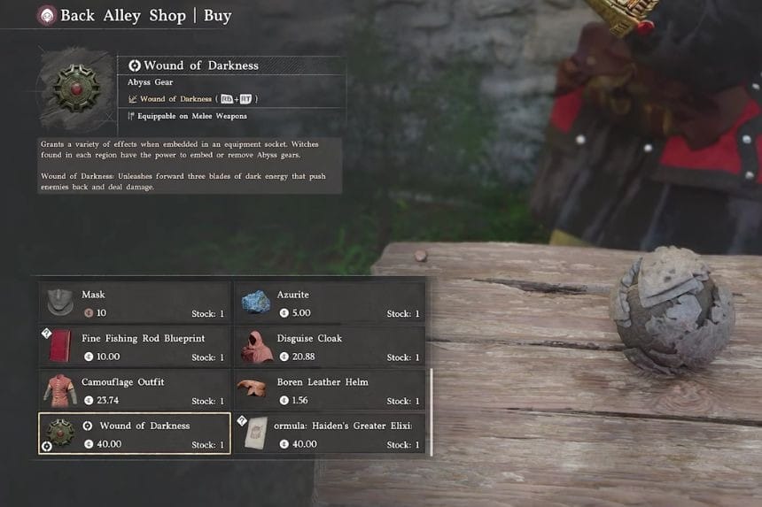 To find it, cross the map over to the lower area near Delesia. Then, head towards the Tan, but do not enter the main area. Instead, go a little towards the right side of the area where a merchant will be waiting. Talk to the back alley merchant and examine his goods to find Wound of Darkness for sale.