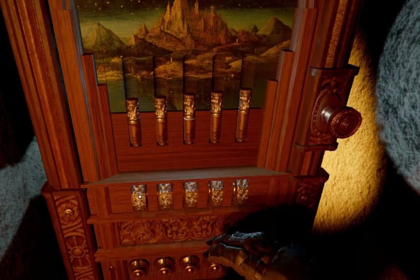 You will have to rotate all the dials downwards, ensuring that all the lock sections align in the middle. When you press the button, all the locks will go up, and they should all be in one position to open the mechanism and find the Relic of Darkness.