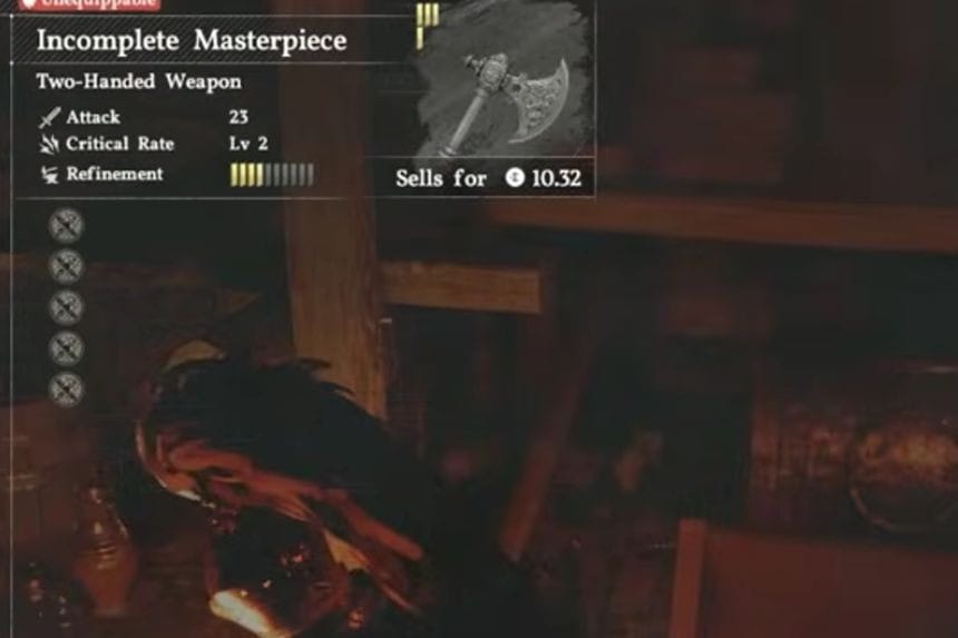 The Incomplete Masterpiece is hidden in a secret room inside Krall Foundry. Inside the Foundry, you will find a hidden room by going through a door near the barrels. Crouch down to enter the hidden room and find a chest containing the Incomplete Masterpiece.