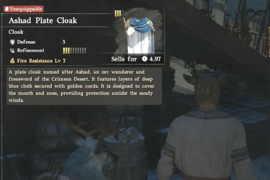 This cloak is part of the Scorehorn faction quests. These quests will only be unlocked after completing 14 militia quests in the Pailune region. The cloak will be part of the Deeprooted Sorrows quest, which involves a three-stage boss battle, so be sure to keep food and healing items before starting.
