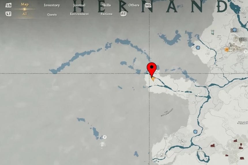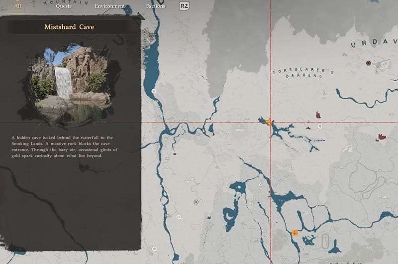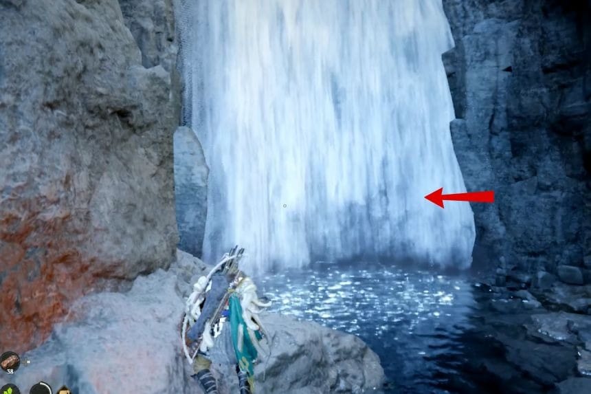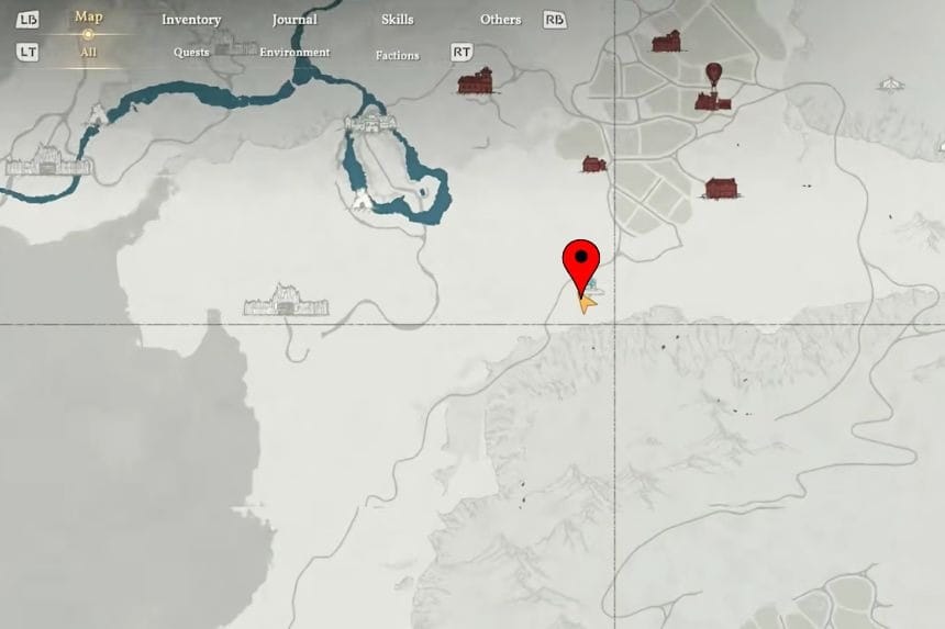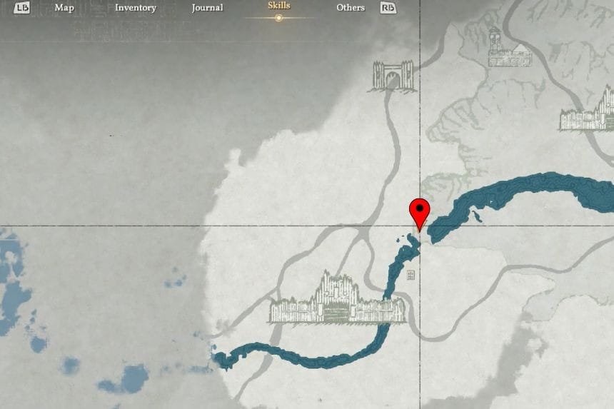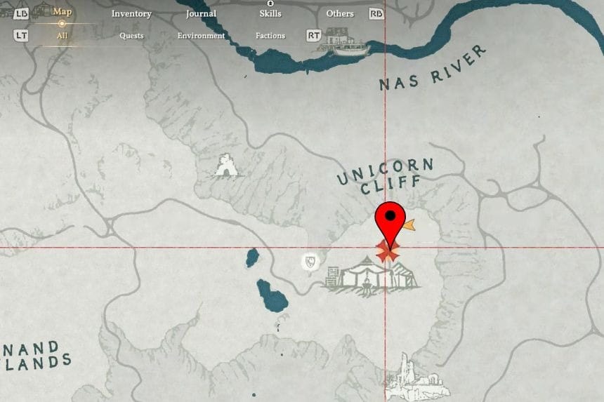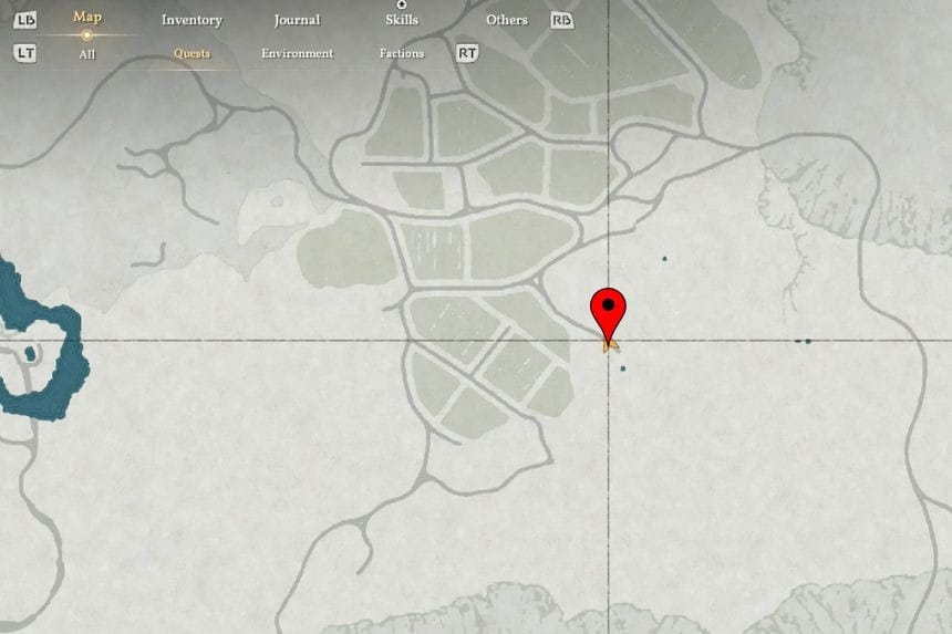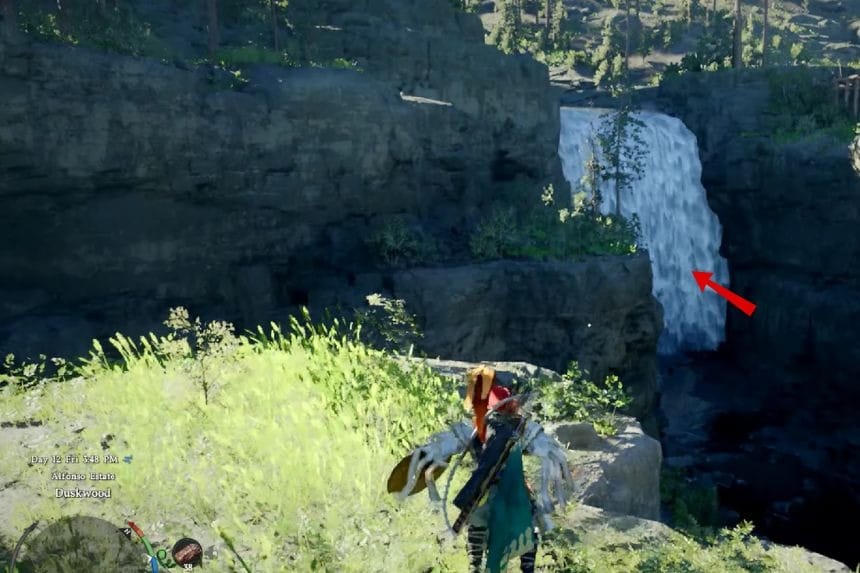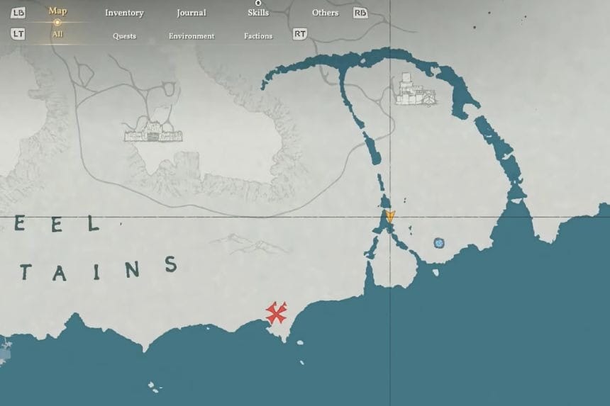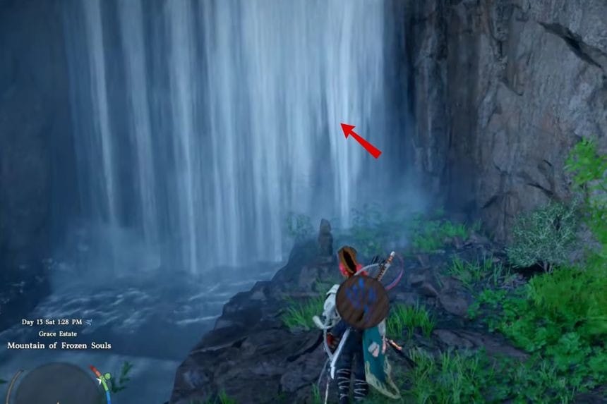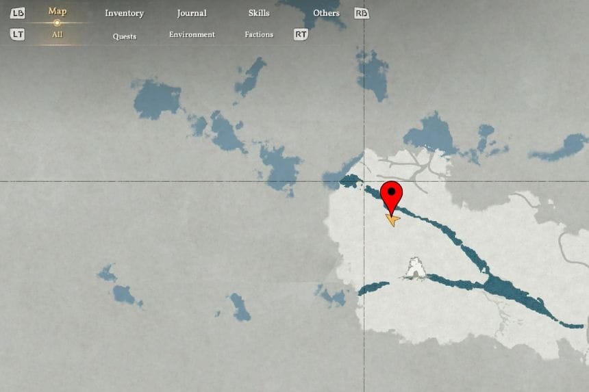 You get the Survivor’s Solitude from a chest hidden behind a waterfall that appears if you follow Lake Kharonso. The waerfall is exactly east from the Scholastone Institute as shown in the map above. To get to the waterfall, go to Lake Kharonso and follow the river up. Once you reach the location, climb up to the waterfall and perform a charged stab on the waterfall, which will allow you to get to the other side. Loot the chest to get the Survivor’s Solitude.