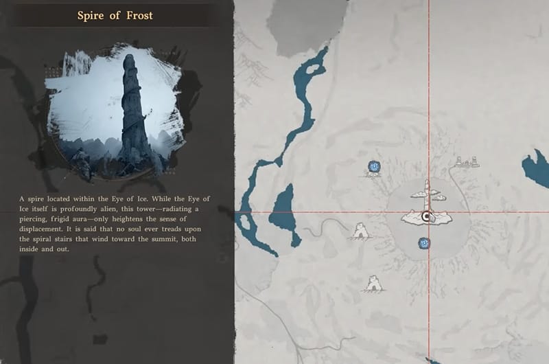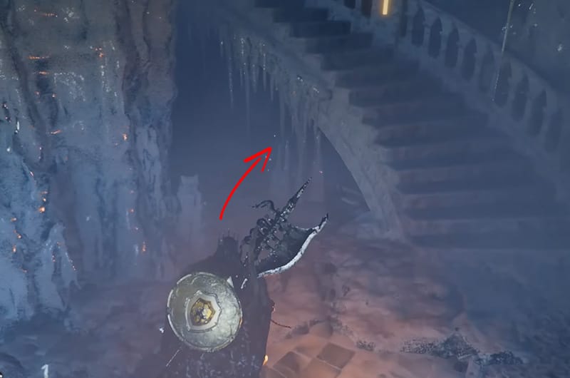 To get the Soul Spear, go to the Tomb of Frozen Souls as shown in the map above. Once you get to the location, walk to the edge of the cliff. You will be able to see a ledge below. Jump on the ledge and turn around to see the entrace. Go in and walk straight until you come to the centre of the mountain with a deep fall.