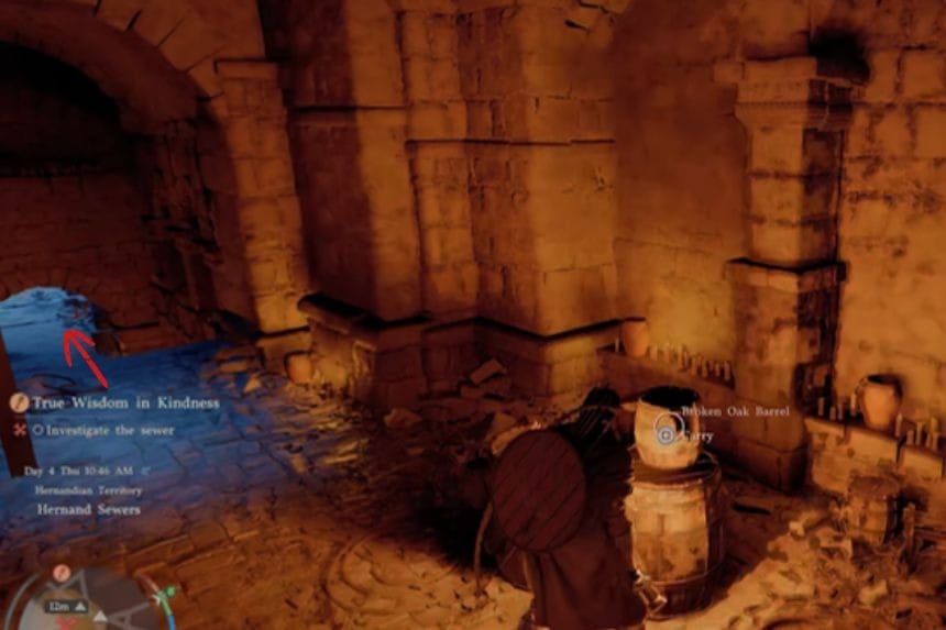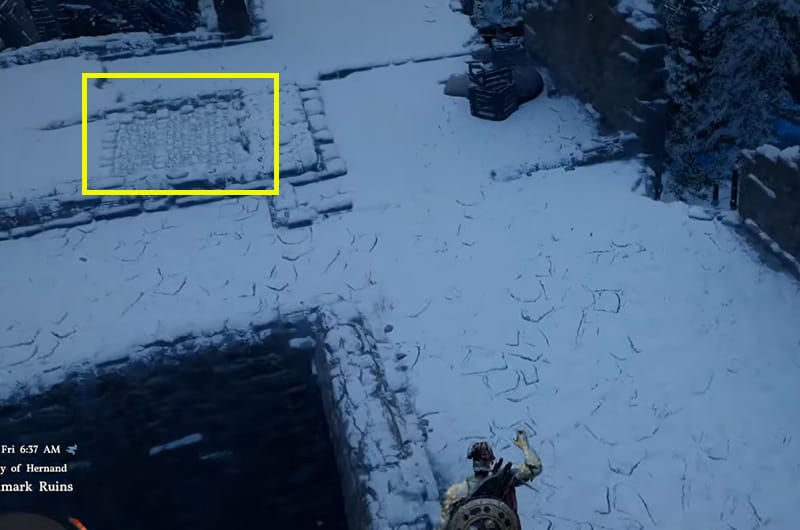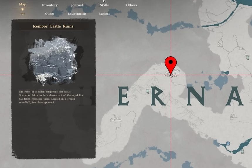 The Icemoor Castle Ruins are located in Hernand. Start by going towards the top level. Once at the top, turn right and find the staircase going down. Follow the stairs and look nearby for a small cave entrance blocked by wooden planks. Break the planks with your weapon, then go inside the cave. Near the chest, check the left side beside a barrel, where you will find the Fallen Kingdom’s Rapier.