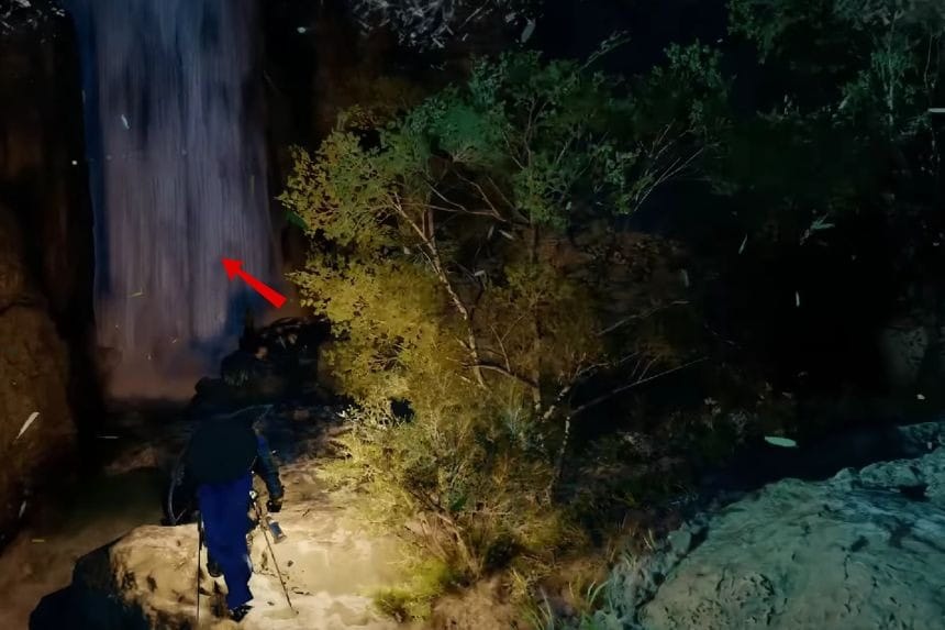 You will find a waterfall where the two rivers are joining with eachother. When you reach the waterfall, jump down to find a cave on the right side. Enter the cave and defeat the Grave Walker. After defeating the Grave Walker, light two lamps on the closed door so that you can enter the area and collect the staff.