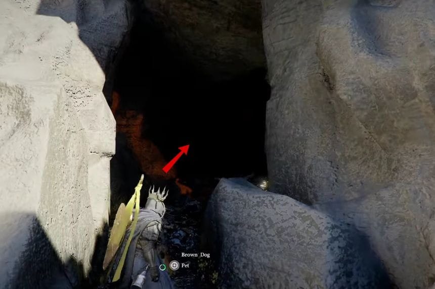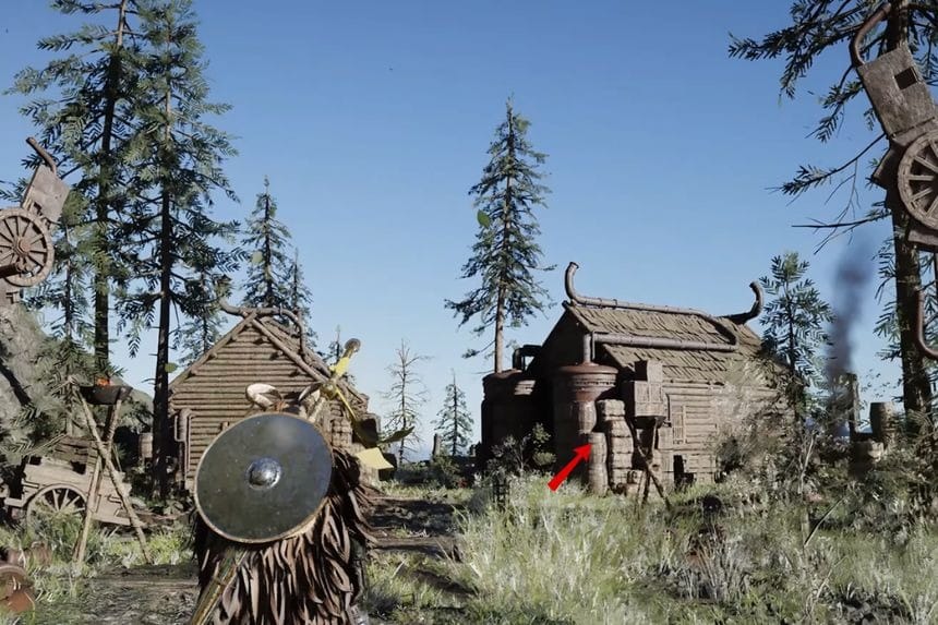 For the next piece – The Helm – you need to go to the Chattering Rocks. Once you arrive at the location, you will notice some vegetation marked in the above image, use the sword glint to burn it and it will reveal a patch that leads to a chest with the Frostcursed Plate Helm.