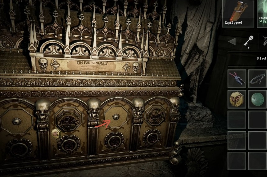 If you want to retrieve the hand cannon, you will have to complete a separate challenge. This puzzle involves finding four animal plates—bat, turtle, dog, and bird—which are located in the graves (tombs/mausoleums) close to where you are standing. To find the weapon, you must put the animal plates in the correct order (with the right number of turns) into the reliquary that contains the hand cannon.