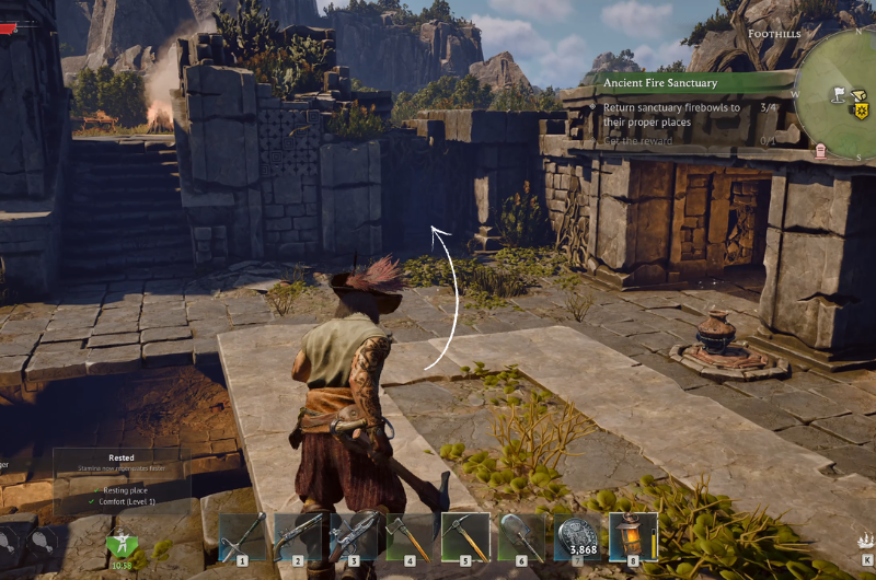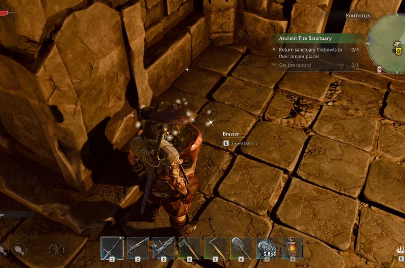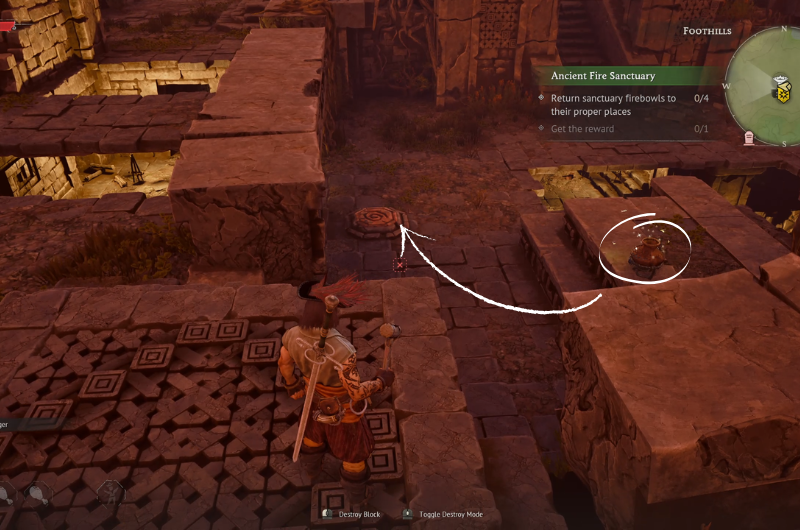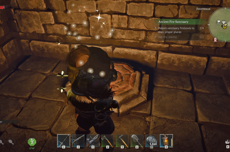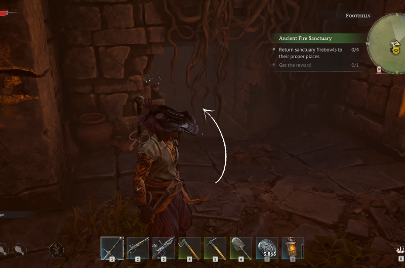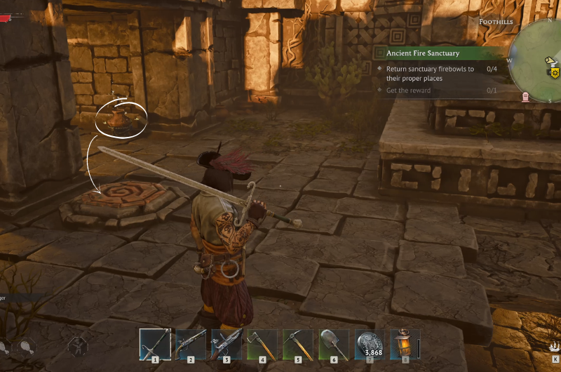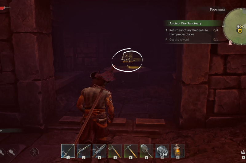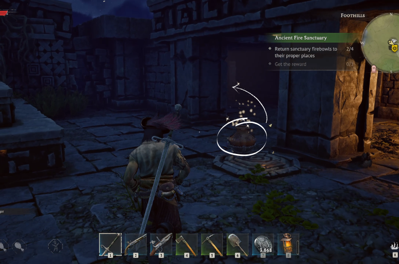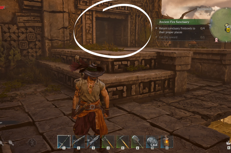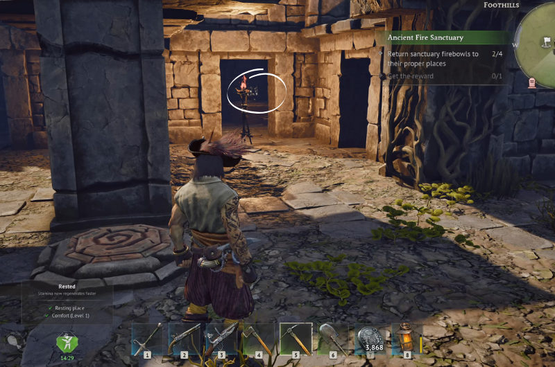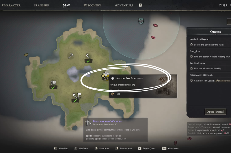 The Ancient Fire Sanctuary can be found at the main quest location – Needle in a Haystack following a sub-quest where you have to search a camp near the ruins. You need to clear the area before proceeding as it’s occupied by enemy pirates.