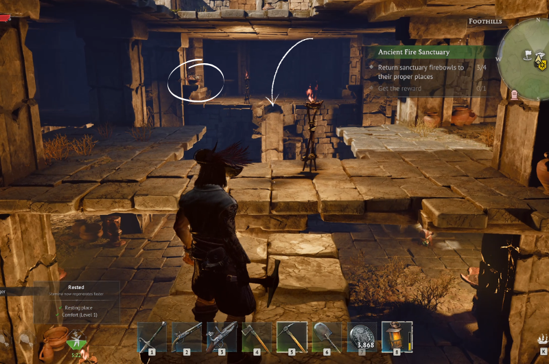 You can find the third firebowl on the middle level but the path to get it is kind of busted, so you’ve to use pickaxe on the pillar, it’ll form a path for you to get above.