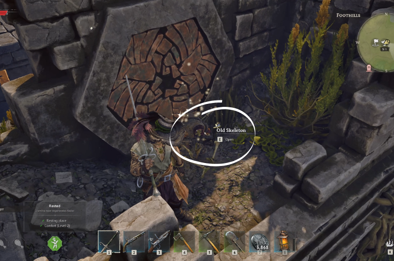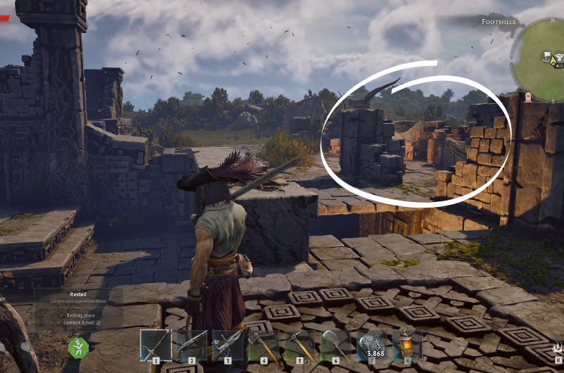 Then from the point where you found the first chest, take left and head above the ruins and follow the path as shown in the first image and you’ll find the third treasure that you can claim from the skeleton.
