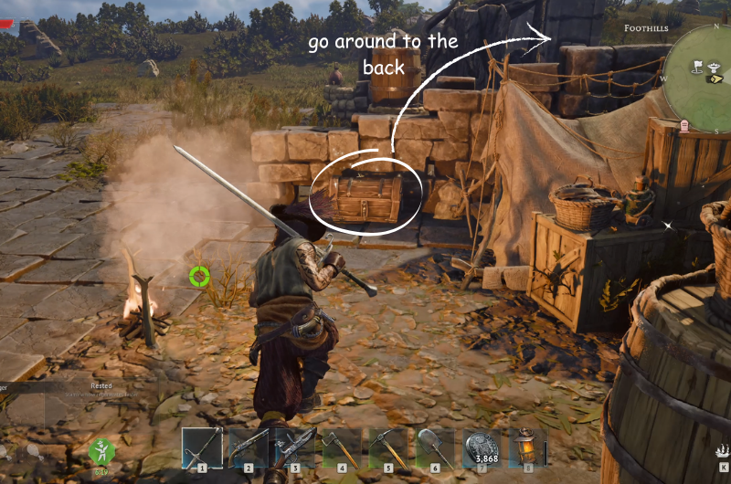 Scout for this camp near the ruins and you’ll find the first treasure chest at the camp. Then go around to the back and you’ll find the second chest.