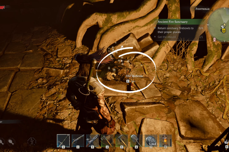 Remember the entrance where you found the first firebowl? Before you enter the room, you’ll notice that there’s a path to the left, head inside and you can loot the skeleton which counts as the fourth treasure.