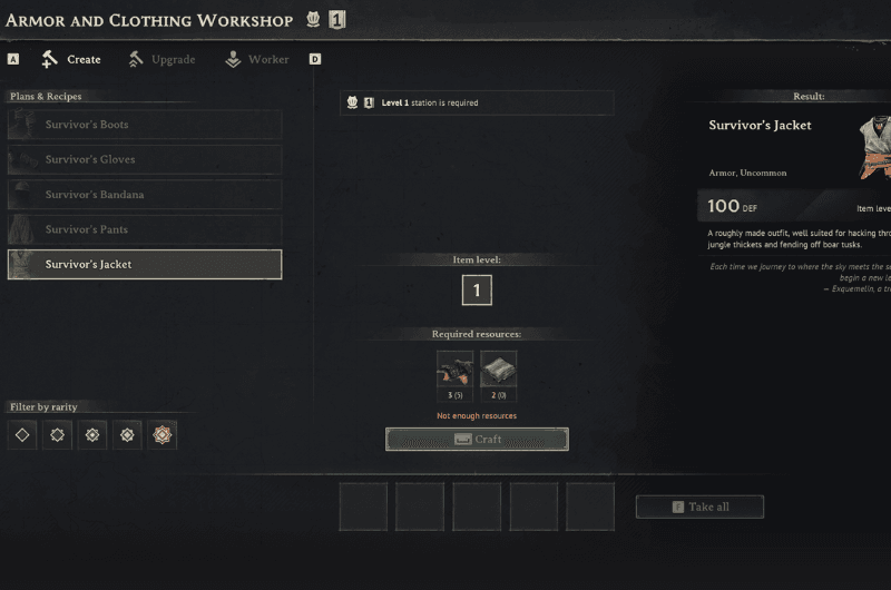 Since you’ve cleared the ruins, you must have gotten the rough hides from killing the wild boars. You can use these to craft the Survivor’s Clothing.