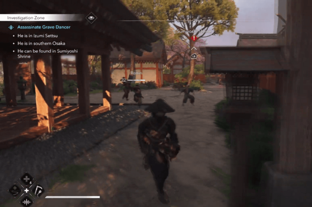 The Grave Dancer is located at the eastern end of the Sumiyoshi Shrine, surrounded by a tough group of enemies. To approach, the shrine’s lush foliage and monuments provide plenty of opportunities to hide and climb. Stick close to the shrine’s borders, moving carefully from bush to bush, and as you near the eastern end, you’ll find the Grave Dancer standing with another member of his gang. Nearby, there’s a building you can climb. Use this to get the jump on him for a quick and easy kill.