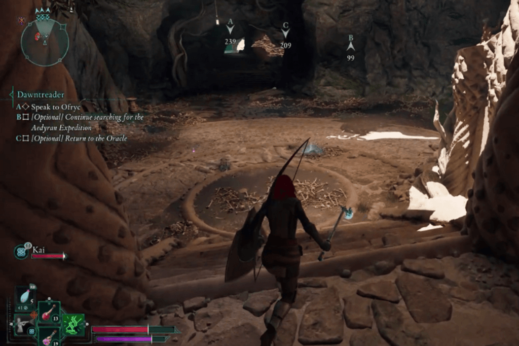 In the next room, go up the stairs on the left and stick to the right wall. Take the tunnel on your right, and you’ll get a nice view of the Oracle’s temple. Turn right again and deal with the xaurips you encounter. Just keep following the marker on your HUD, grabbing loot as you go. You’ll eventually bump into Caedmon. Have a chat with him, and he’ll fill you in on the Oracle and the temple, plus give you a new, optional objective.