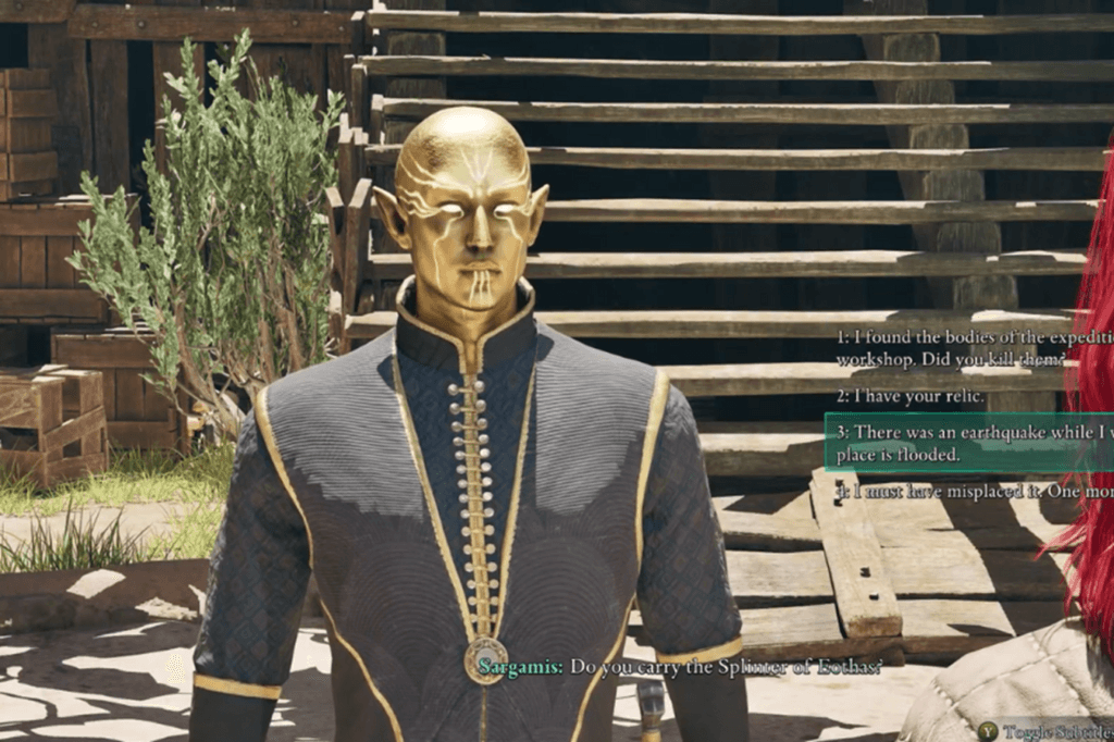 When you talk to Sargamis again, you’ve got some choices. You can pretend you don’t have the relic, you can attack him, or you can “help” him. But honestly, no matter what you pick, things pretty much play out the same way in the end.