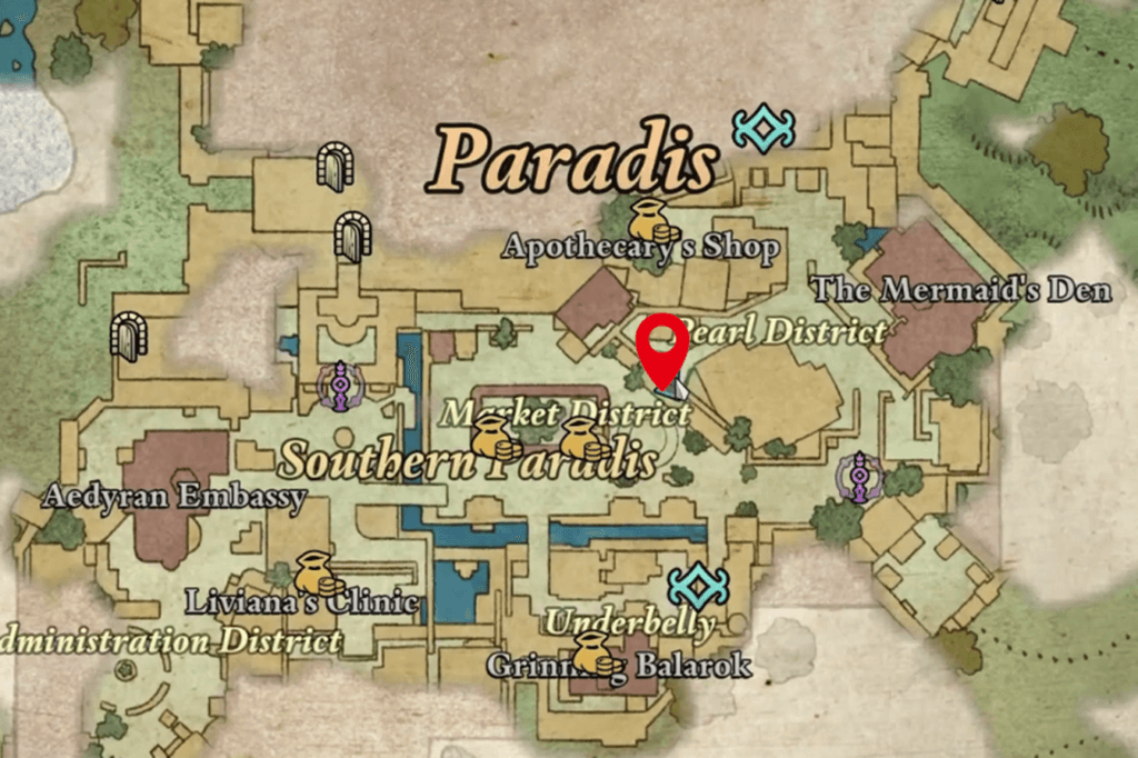 To find the Golden Scale of Justice in Paradis, you won’t find it in Hightown. It’s tucked away in the northern part of the Market District, west of the Apothecary’s Shop. Getting to it requires a bit of climbing and jumping.