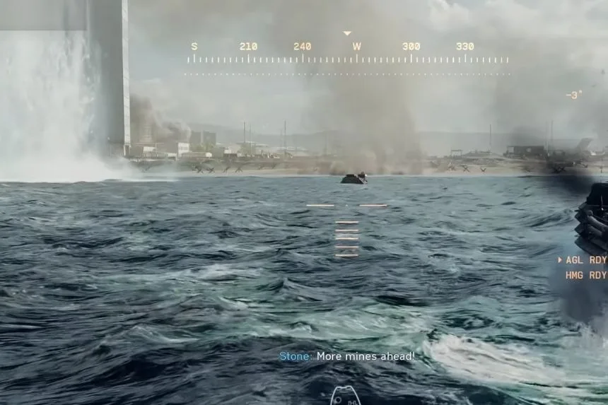 At the start, you will be on a turreted vehicle moving toward land. Shoot and destroy at least three of the black floating mines with red lights to earn this trophy.