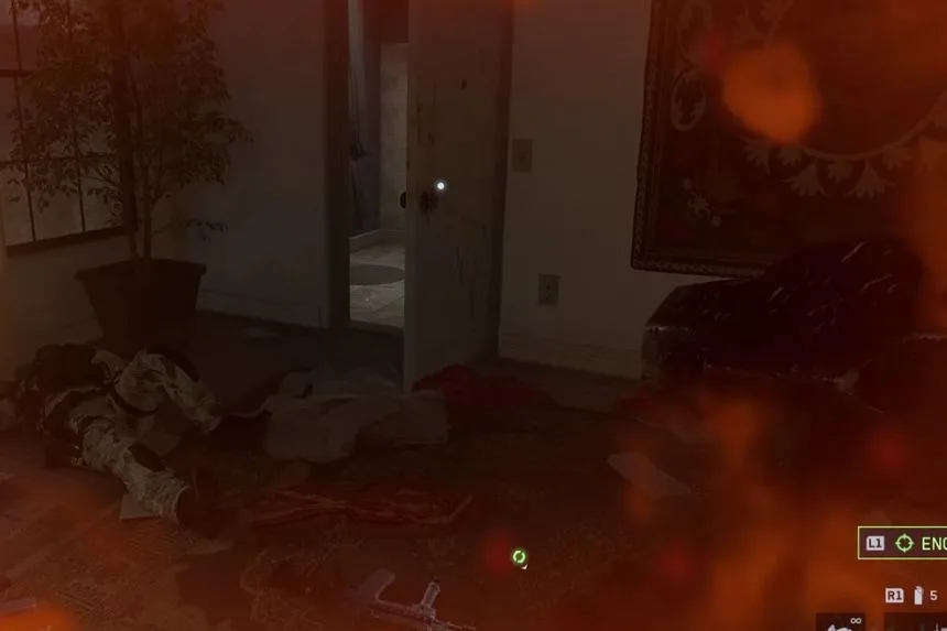 After entering the palace, you will reach a section on fire. Go upstairs, then north toward the first door your squad stacks up by. Clear the enemies, enter the back bathroom, and grab the tag stuck in the wall with a knife.