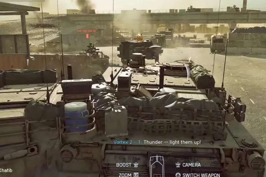 Destroy a tank by collapsing a section of road on it. This can be done right at the start, shoot the bridge supports until it falls and crushes the tank.