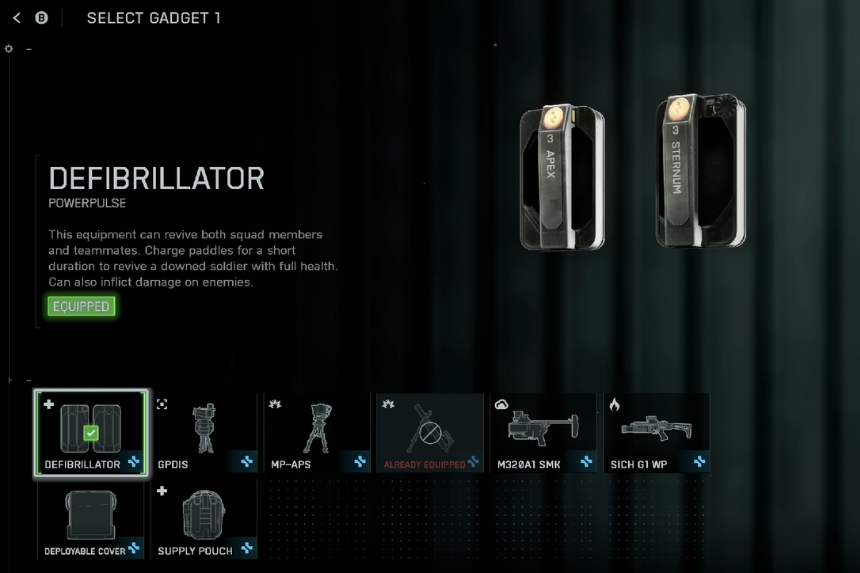 This Support build is all about being quick on the frontline. You’ll use the defibrillator to revive teammates fast, the supply bag to keep everyone stocked on ammo and health, and the Combat Medic Training Path to get helpful boosts like making your Ballistic Shield stronger and reviving downed teammates faster.